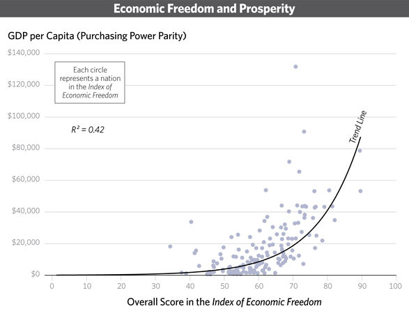 Even modest commitments to market institutions can yield big dividends, as China has lately discovered. And at the top end of the economic freedom graph... well... to be honest, we're not exactly sure yet. As economic freedom rises, so does per capita GDP, but the relationship doesn't seem to top out at any level of economic freedom that we've observed in the real world . For all we know, it would appear to just keep getting better.