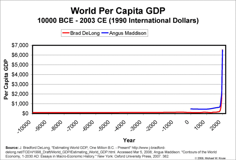 These historical anecdotes merely give flesh to the bare bones of this kind of graph, no doubt familiar to most libertarians. This one is from economist Brad DeLong.