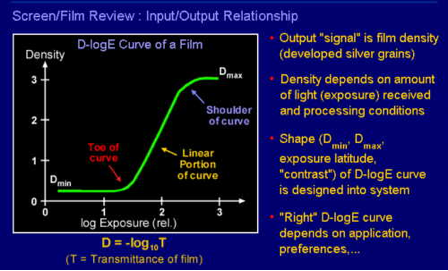 In learning how to expose radiographs, radiology technologists (RTs) are introduced to what is called a Hurter–Driffield curve, or H & D curve, also known as a Characteristic Curve because it has a characteristic appearance for a given film/screen combination. Here’s the point: When you plot the optical density (the gray scale) of a radiographic film as a function of (the log of) the exposure (the percentage of photons transmitted through the patient), you get a sigmoid shaped curve like this: